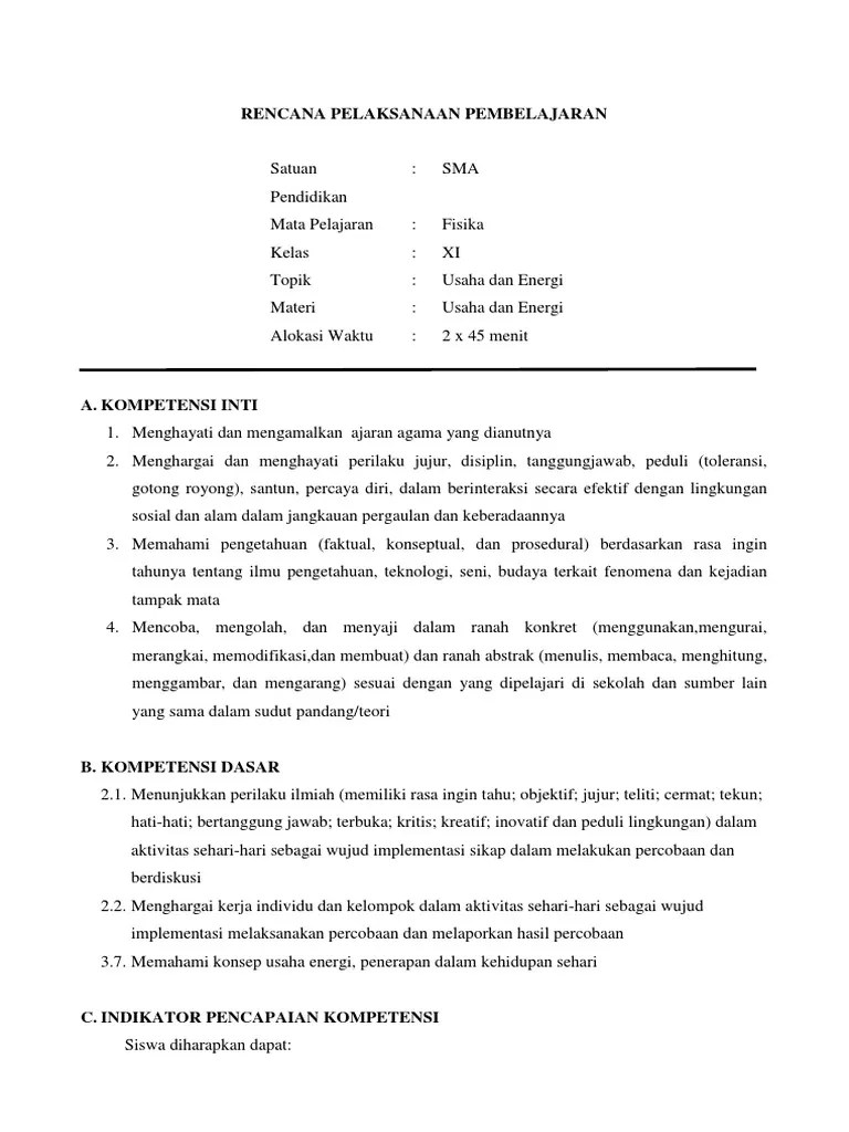 Doc rpp kurikulum 2013 revisi 2017docx sridini sopiani. Menanyakan kepada siswa pengertian usaha dan energi setelah menayangkan kelanjutan video. Berikut ini saya bagikan rpp mata pelajaran fisika kelas x kurikulum 2013 (revisi 2016). Xi sma semester 1 berdasarkan kurikulum 2013 usaha dan energi disusun oleh . Energi" telah diuji dan disahkan oleh fakultas keguruan dan ilmu pendidikan.